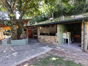 Espaço gourmet completo, todo equipado com KIT COZINHA CAIPIRA (fogão à lenha, forno e churrasqueira).